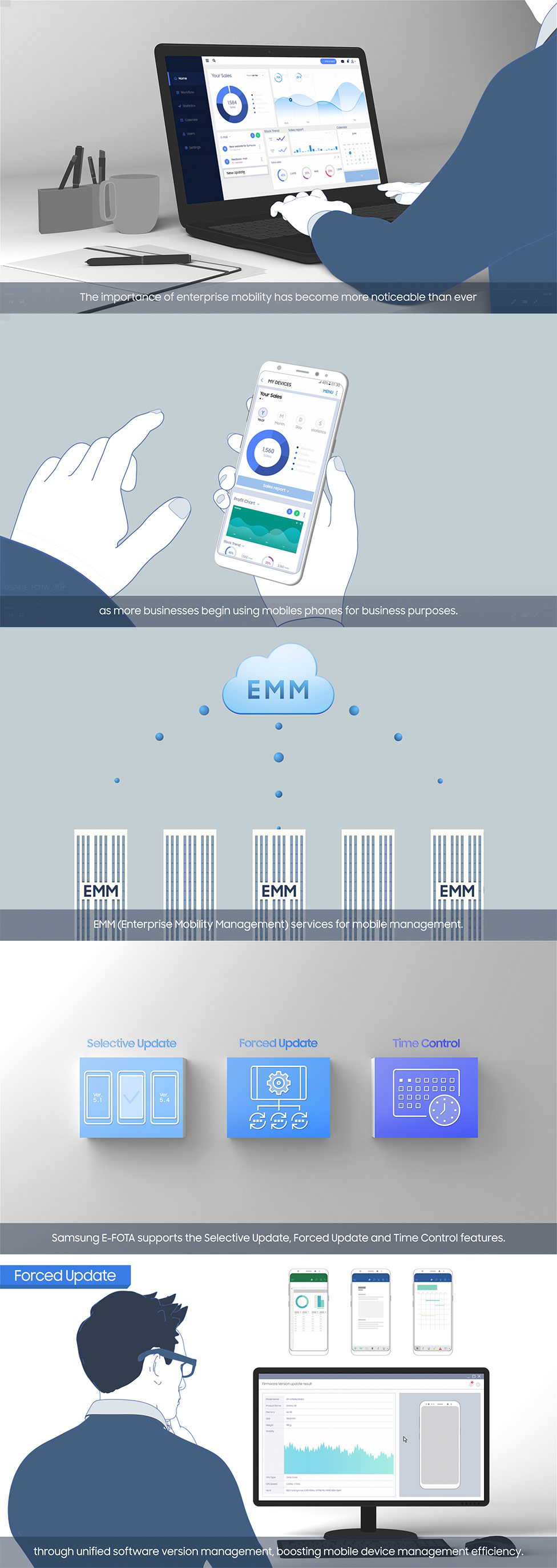 기존 FOTA의 단점을 노출한 뒤, 삼성의 Enterprise FOTA의 장점을 상황 및 인포그래픽을 활용하여 비교설명 하는 컨셉으로 전반적으로 기술적인 부분의 신뢰성을 영상에 노출하고자, 차분한 톤 앤 매너로 영상을 제작.