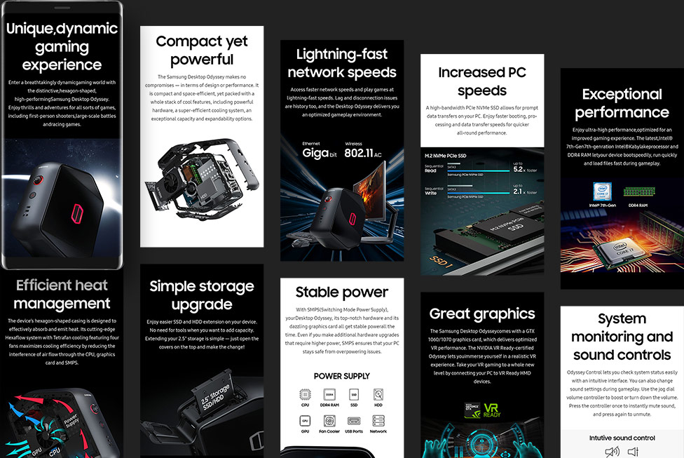 게이밍 데스크탑이라는 제품 컨셉에 맞추어 데스크탑이 갖추고 있는 고성능을 강조할 수 있는 흐름으로 기획 및 제작.